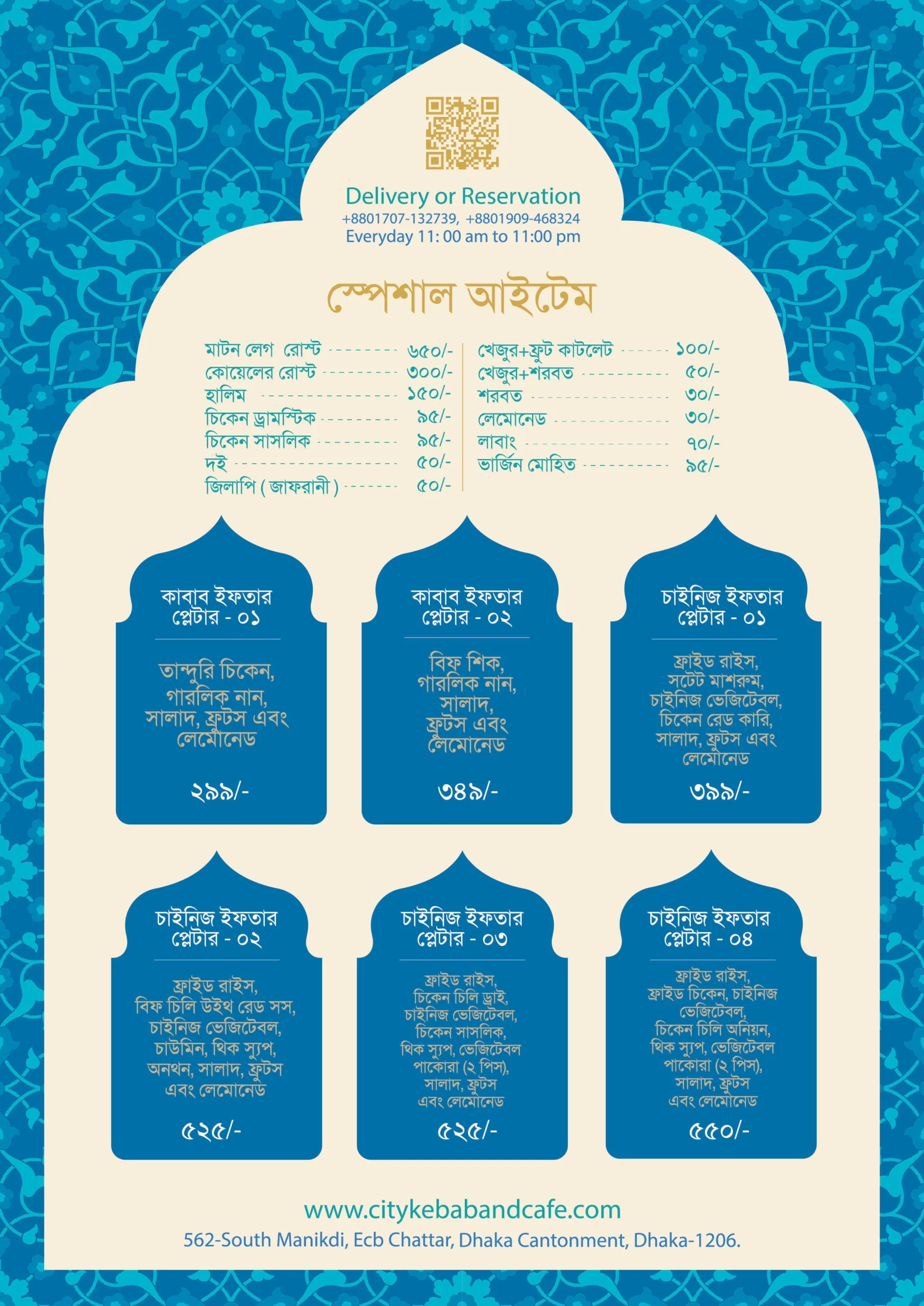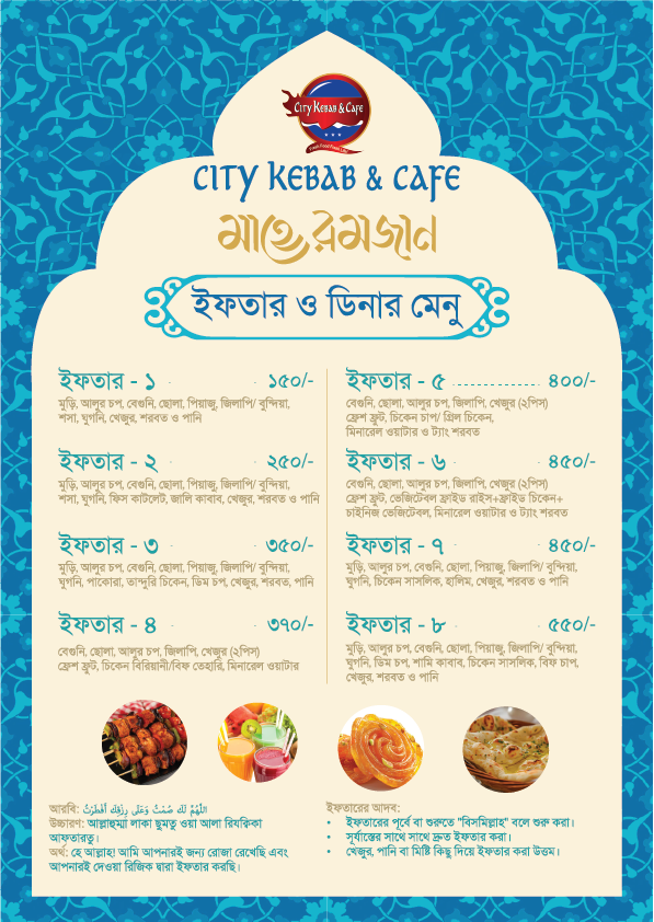 Menu. Appetizer City Cafe Sp. Fried Wonthon(4pcs/6pcs) ৳185/265 Chicken Fried Wonthon(4pcs/6pcs) ৳165/235 Spring Rolls (4pcs/6pcs) ৳145/215 Naga Hot Wings (6pcs) ৳255 Chiken Lolipop (4pcs) ৳245 Fried/Saute Mushromm ৳255 Crispy Fried Chicken (1pcs) ৳115 POp chicken (4pcs/6pcs) ৳245/355 Thai Fried Chicken (4pcs/8pcs) ৳225/445 POpato Wedges ৳165 French Fries (M/L) ৳145/195 Salad City Cafe Sp. Cashew-Nut Salad ৳465 Chicken Cashew-Nut Salad ৳365 B.B.Q Chicken Salad ৳325 Green Salad ৳165 Soup City Cafe Sp. Cream Of Chicken/ Mushroom 1:1/1:3 ৳185/545 Thai Soup Special Thick 1:1/1:3 ৳155/455 Thai Soup Clear 1:1/1:3 ৳145/435 Chicken Corn Soup 1:1/1:3 ৳125/375 Chicken Veg: Soup 1:1/1:3 ৳115/345 Hot $ Sour Soup 1:1/1:3 ৳135/385 Chicken Chicken Chilli Onion ৳295 Chicken Masalla ৳355 Chicken Butter Masalla ৳365 Chicken Achari ৳355 Chicken Sizzling ৳495 Beef Beef With Garlic ৳485 Beef Chilli Onion ৳495 Beef Masalla ৳465 Beef Achari ৳475 Beef Sizzling ৳595 Prawn Sweet & Sour Prawn ৳445 Prawn With Garlic Pepper ৳425 Prawn Chilli Onion ৳395 Prawn Masalla ৳485 Vegetable City Cafe Sp. Thai Vegetable ৳395 Chicken Vegetable ৳345 Chinese Vegetable ৳285 Chinese Vegetable (1:1) ৳125 Rice City Cafe Sp. Mixed Fried Rice ৳395 Chicken Fried Rice ৳355 Egg Fried Rice ৳325 Chowmein City Cafe Sp. Chowmein ৳395 Chicken Chowmein ৳325 MIxed Chowmein ৳375 Chicken Chowmein (1:1) ৳155 Nachos ৳255 Set Menu Egg Fried Rice + Thai Fried Chicken-2pcs+Spring Roll+Chinese Veg ৳225 Egg Fried Rice + Beef Curry + Spring Roll+ Chinese Veg ৳285 Egg Fried Rice + Chicken Chilli Onion + Spring Roll + Chinese ৳265 Egg Fried Rice + B.B.Q Chicken + Spring Roll + Chinese ৳295 Thai/Corn Soup + Spring Roll + Egg Fried Rice + Thai Fried Chicken + Prawn Chilli Onion + Chinese Veg ৳395 Set Menu Family Combo For 4 PersonThai Soup/Corn Soup (Large), Wonthon 4 pcs, Thai Fried Chicken 4 pcs, Chicken Chilli Onion, Egg Fried Rice 1:4, Chinese Veg 1:4, ৳1955 Family Combo For 6 PersonThai Soup/Corn Soup 1:6, Wonthon 6 pcs, Thai Fried Chicken 6 pcs, Chicken Masalla 1:6, Egg Fried Rice 1:4, Chinese Veg 1:4 ৳2855 Italian Pizza & Oven Baked Pasta City Kebab Sp. Pizza Shirmp, Chicken Beef Pepperoni, Cupsicum Black Olive, Onion & Chese 7" ৳445 10" ৳745 Tandoori(Tandoori Chicken, Mushroom, Pepperoni Cheese, Tomato, Others) ৳425 ৳225 Mexican Hot(Black Olive, Chicken, Hot Pepper, Cheese) ৳395 ৳625 4 season(Chicken, Beef, Prawn, Cheese, Mushroom, Salami Black Olive) ৳425 ৳725 BBQ(BBQ Chicken, Cheese, Capsicum, Mashroom, Tomato) ৳415 ৳685 Margharita(Cheese, Capsicum, Tomato, Garlic) ৳375 ৳585 City Kebab Sp. Baked Pasta ৳255 Dessert ICE Cream Vanila/Chocolate/Strawbery ৳195 Fruit Coktail with ICE Cream ৳225 Faluda ৳195 Coffee Hot/Cold Cold Coffee (M/L) ৳95 ৳155 Cold Coffee With ICE Cream ৳185 Orio Cold Coffee (M/L) ৳115 ৳175 Regular Coffee ৳95 Black Coffee ৳65 Cappuccino ৳125 Flavour Tea ৳45 Soft Drinks & Water Fresh Juice (Malta, Papaya, Mango) ৳175 City Cafe Sp. Lassi ৳135 Milk Shake ৳145 Smoothie (Mango/Banana) ৳175 Blue Ocean ৳185 Lemon Cruch ৳95 Soft Drinks Glass M.R.P Water (M/L) M.R.P Live BBQ Indian Beef Seekh ৳225 Chicken Boti Kebab ৳185 Chicken Hariyali Kebab ৳195 Chicken Reshmi Kebab ৳215 Chicken Tandoori (Qutar) ৳175 Chicken Tandoori (Half) ৳345 Chicken Tandoori (Full) ৳685 BBQ Chicken Wings 6 pcs ৳175 Live BBQ Indian Set Menu Mixed Platter-Meat-Lover (family cCombo 4 Person)Beef Seekh Kebab + Chicken Boti Kebab + Chicken Hariyali Kebab + Chicken Reshmi + Tandoori Chicken 2pcs + Chicken Wings + Plain Naan 2Pcs + Rosted Potato Salad With Large Minaral Water ৳1375 Mixed Platter-Meat-Lover (Family Combo 6 Person)Beef Seekh Kebab 2 Pcs + Chicken Boti Kebab + Chicken Hariyali Kebab + Chicken Reshmi + Tandoori Chicken 2pcs + Chicken Wings + Plain Naan 3Pcs + Rosted Potato Salad With Large Minaral Water ৳1745 Naan Plain Naan ৳225 Butter Naan ৳185 Garlic Naan ৳195 City Kebab Special Naan ৳215